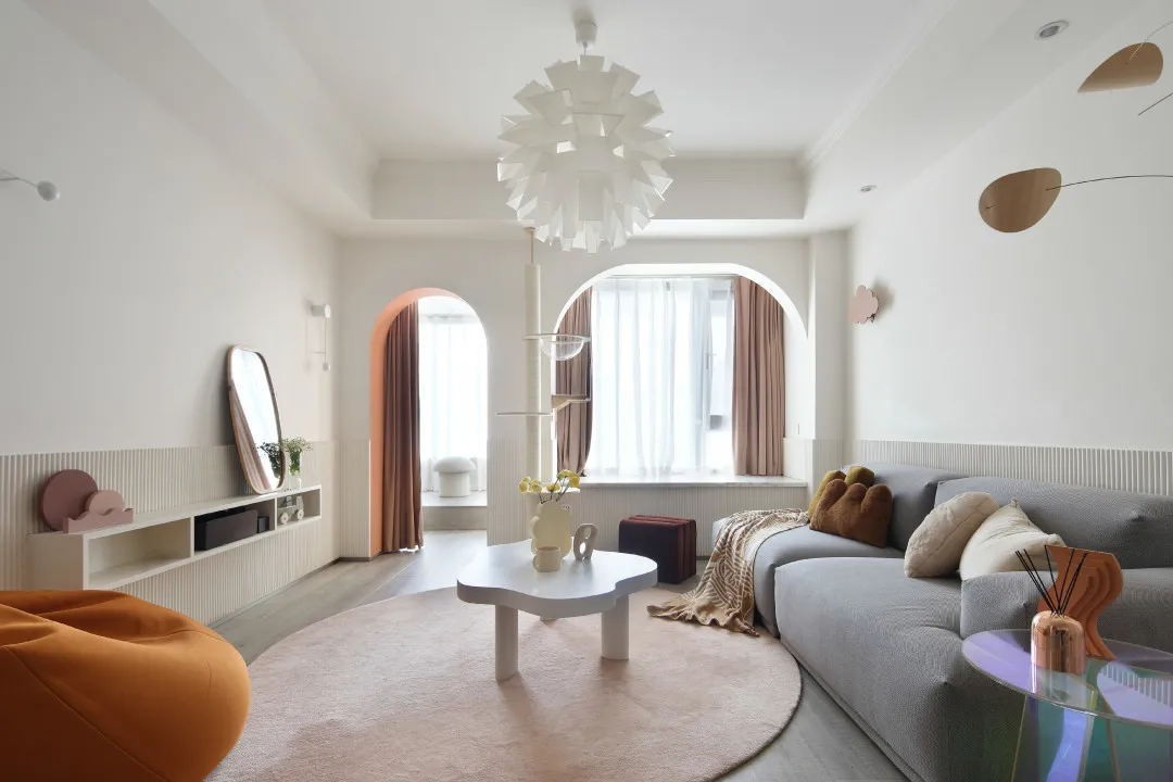 室内以白色和粉橘为主调色, 奶白色简洁大方又温柔, 粉橘色则为房子增添了鲜活与甜蜜。