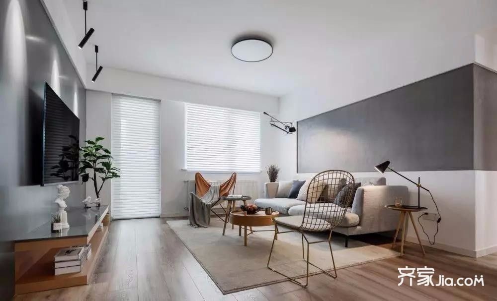 客厅以白色为主调,良好的采光性使空间通透明亮,加入简约的灰色以及温润的原木色,整体安静而舒适