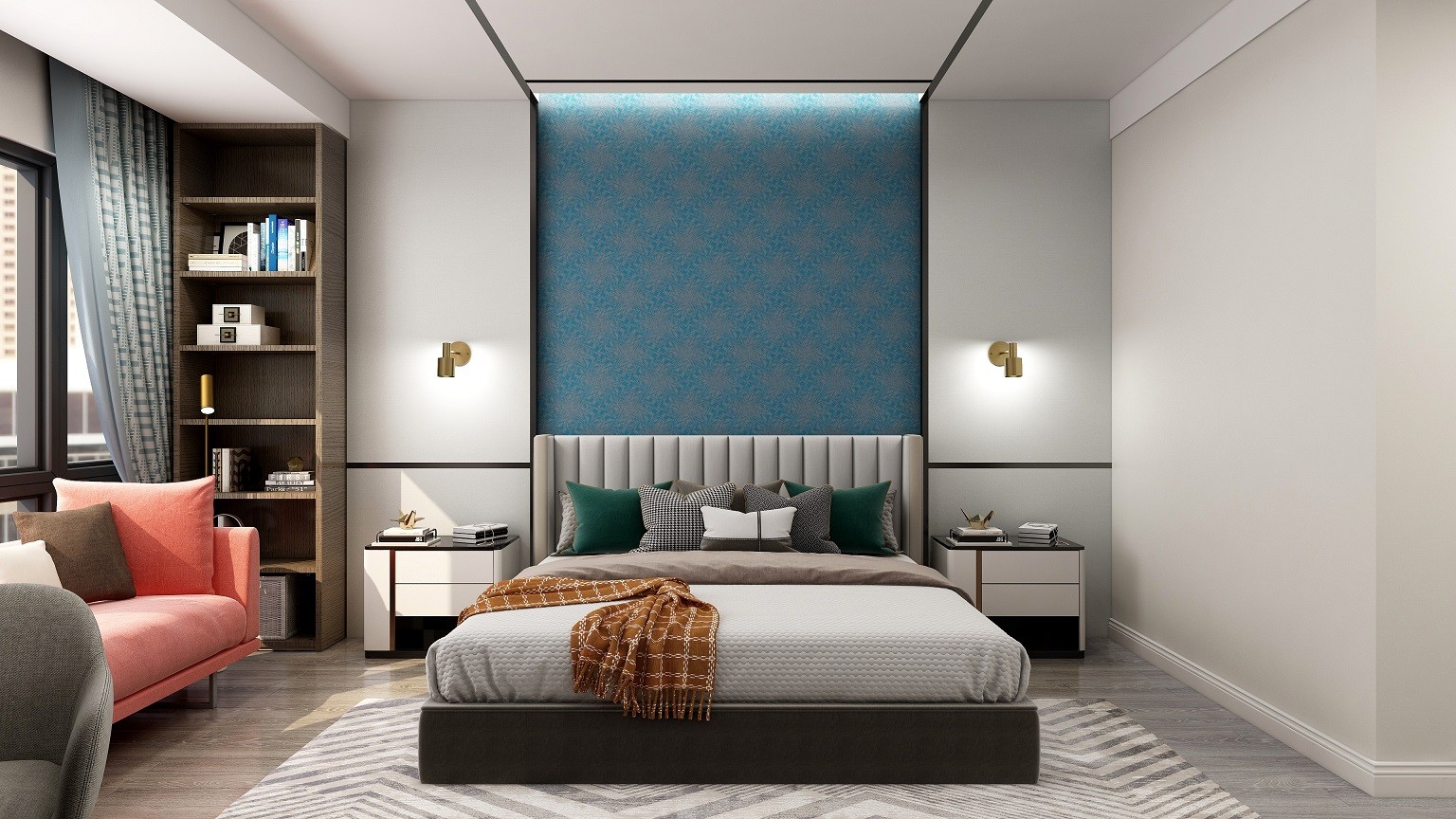 卧室则是借鉴了部分新中元素 配合蓝色背景墙 整体大气简约