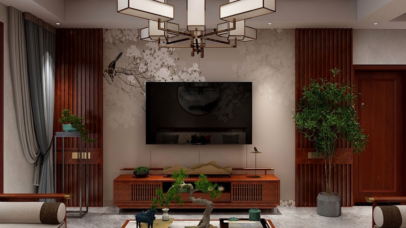 电视背景墙采用墙布加红胡桃护墙板搭配。搭配柔和的灯光凸显中式氛围。