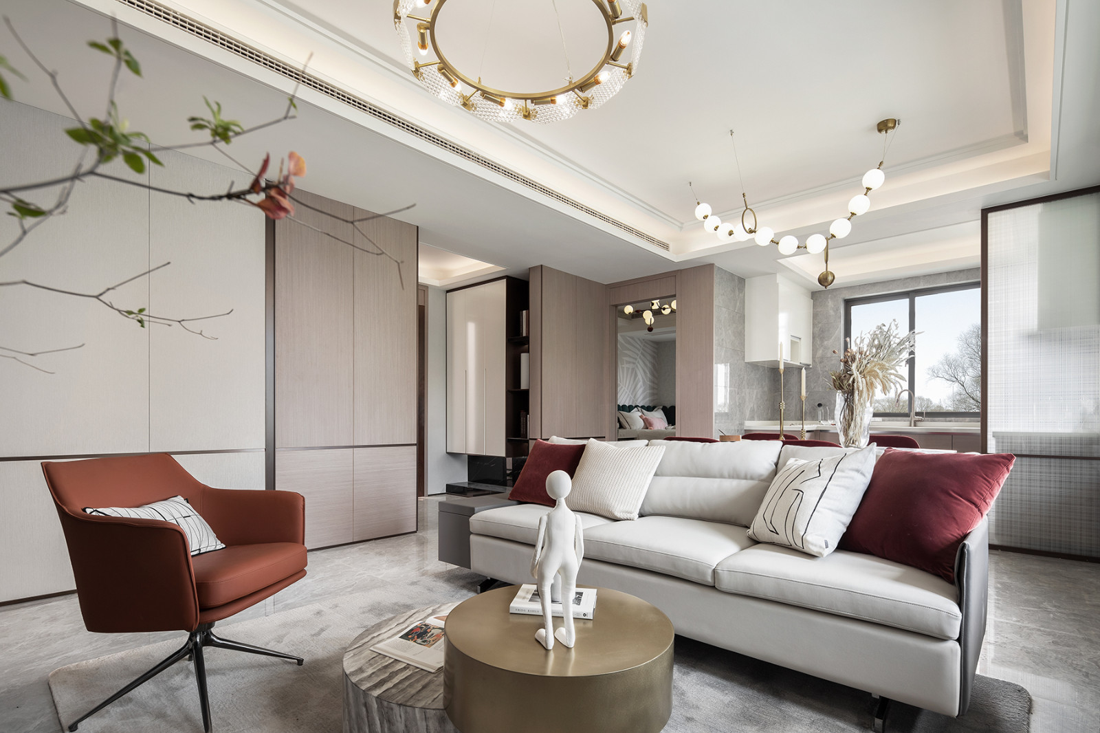 开敞式厨房和餐厅整 体连通,保证家庭动线合理,客餐厅相结合的设计。主卧室做了套间功能,增加了衣帽间。