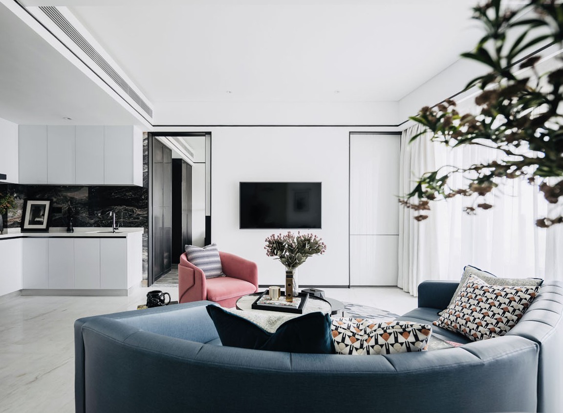 浪漫,对于她而言,是生活的必要条件。 细腻而简约的石膏线、蓝色弧形餐椅, 细节处,我们依然能够寻觅到法式的浪漫及精致考究,以一种更贴合现代审美的方式。