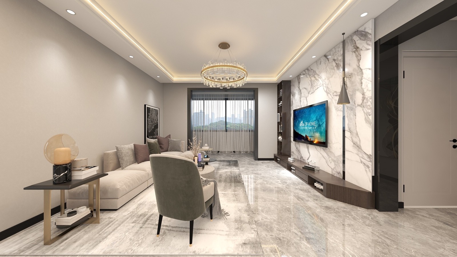 客厅的设计有一种特别的都市感,细致而不繁复,华丽又不张扬。采用了石材,丝绒,木饰面的材质,让房间里的颜色材质的层次更加丰富。