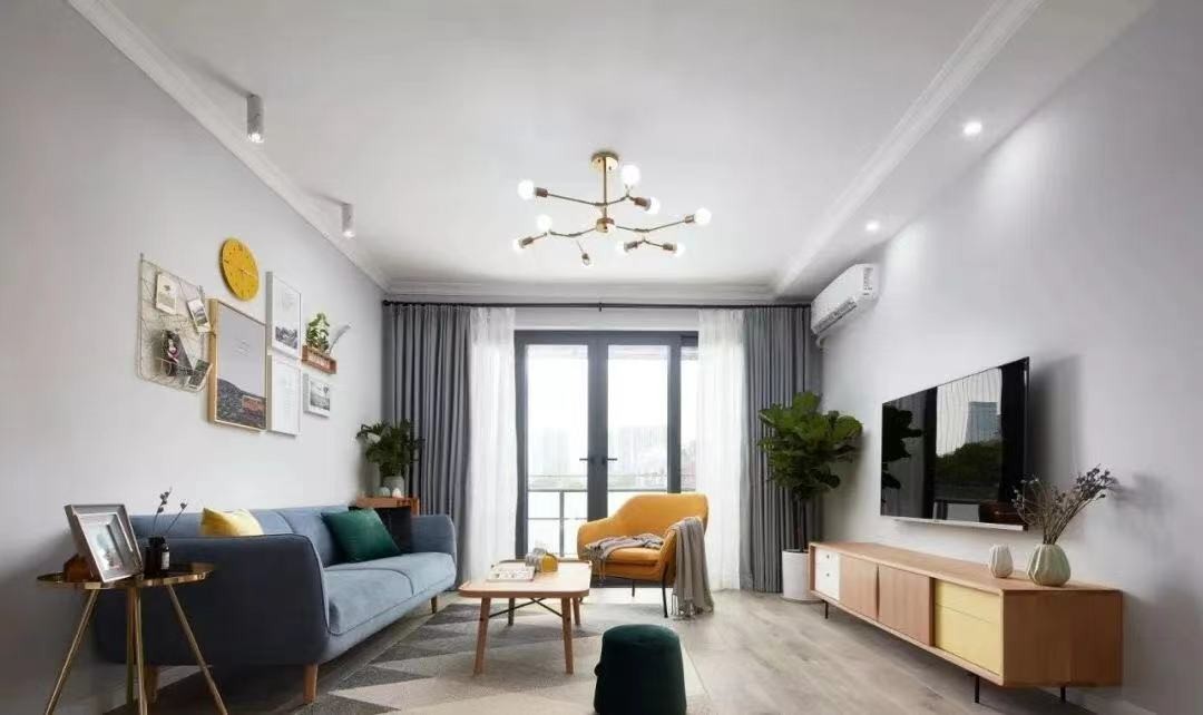客厅地面通铺原木色地板,干净利落。乳胶漆选用嘉宝莉,环保,覆盖性好,不容易透底,有效减少开裂情况