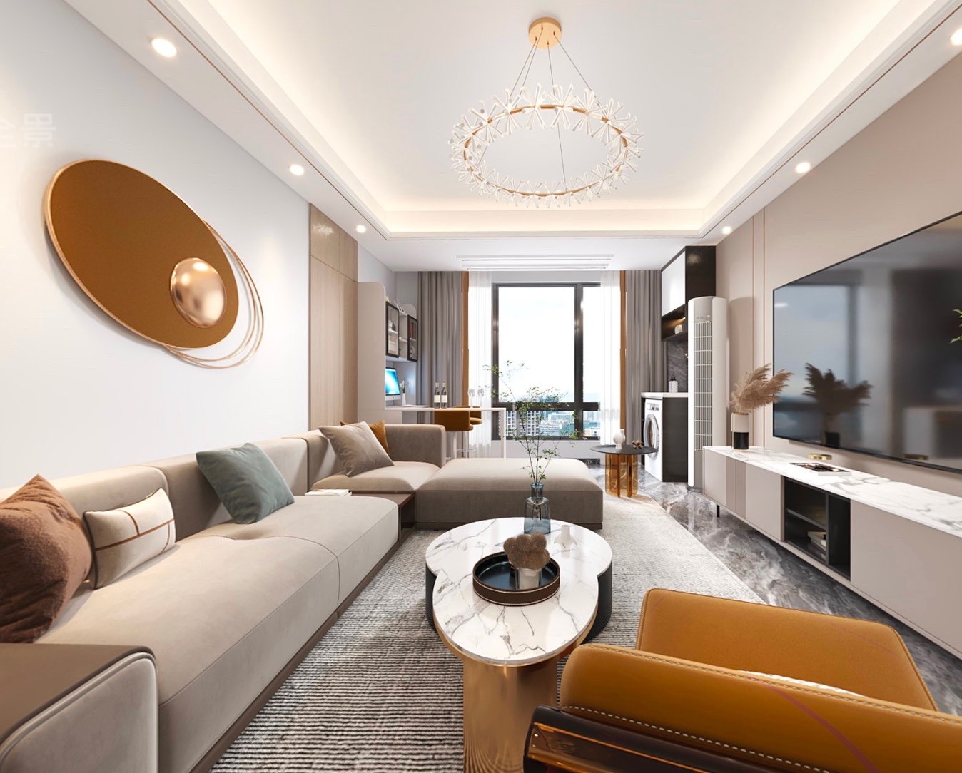 电视墙调色乳胶漆和金属条搭配,低调奢华,吊顶简单的二级吊顶和金属条做搭配,体现出现代轻奢风