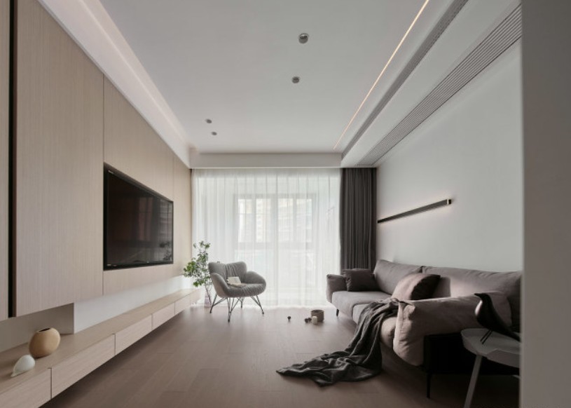 以光为媒,改造后的客厅,采光变好了,一切从生活功能性出发,客厅采用无主灯设计,很好的利用了点光源和线性光源,营造出空间的立体感和温馨的家庭生活氛围。 现在的客餐厅采光通透,视野开阔。局部的灯光点缀,让简约的空间不会那么单调,反而散发出恰到好处的温柔。电视背景墙采取木饰面装饰造型,把电视内嵌,让空间看起来更简洁清爽,满足业主对纯净空间的向往。悬空抽屉式电视柜,方便机器人打扫卫生,自身还可以储物。