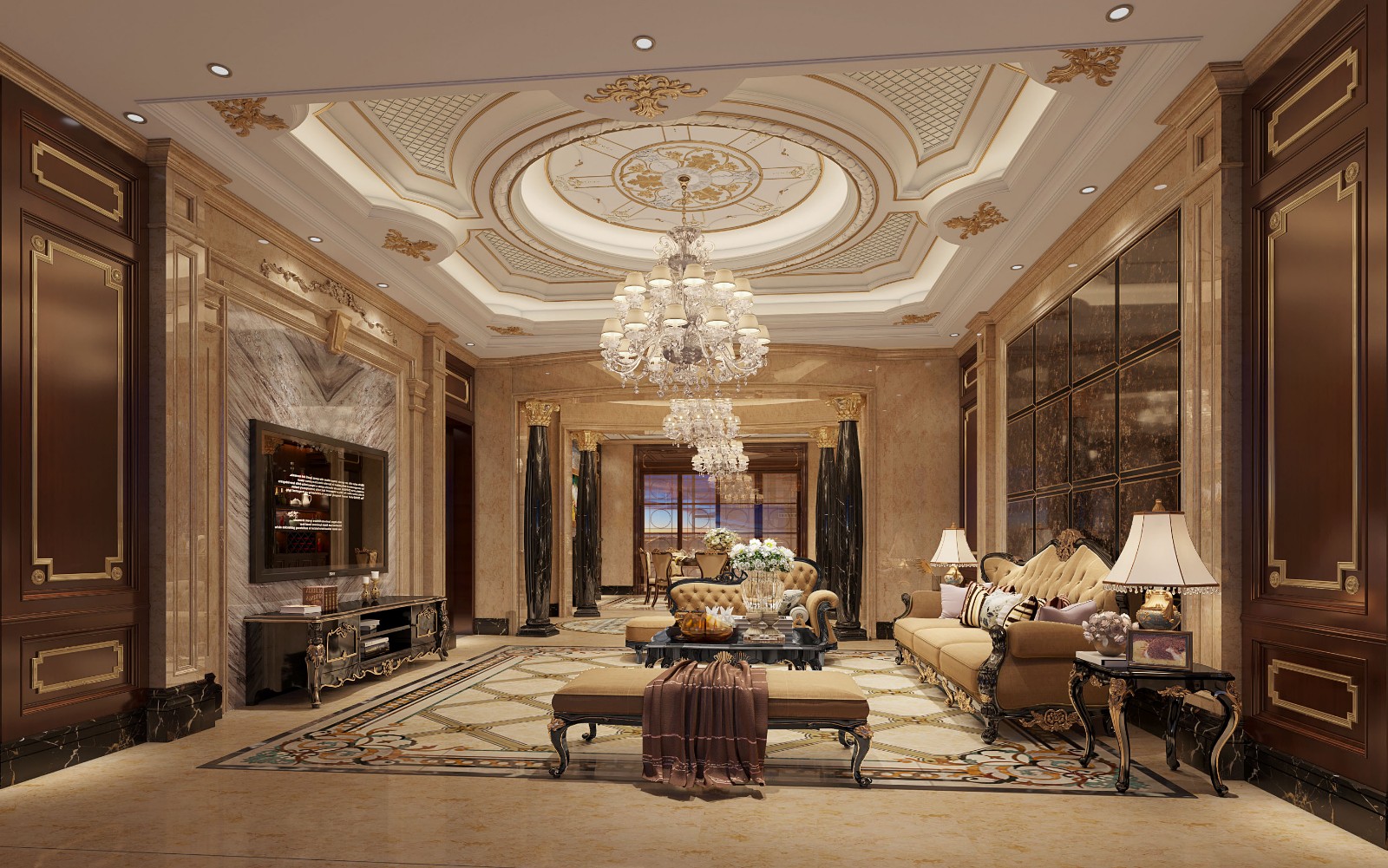 在造型上,以欧式线条勾勒出不同的装饰造型,气势恢宏、典雅大气,材质上采用大理石等,强调了稳重、华贵与舒适。顶部大量的采用圆形造型,让视觉冲击力更强。最终营造出视觉冲击力极强,奢华、高贵而适宜现代人居住的舒适空间。
