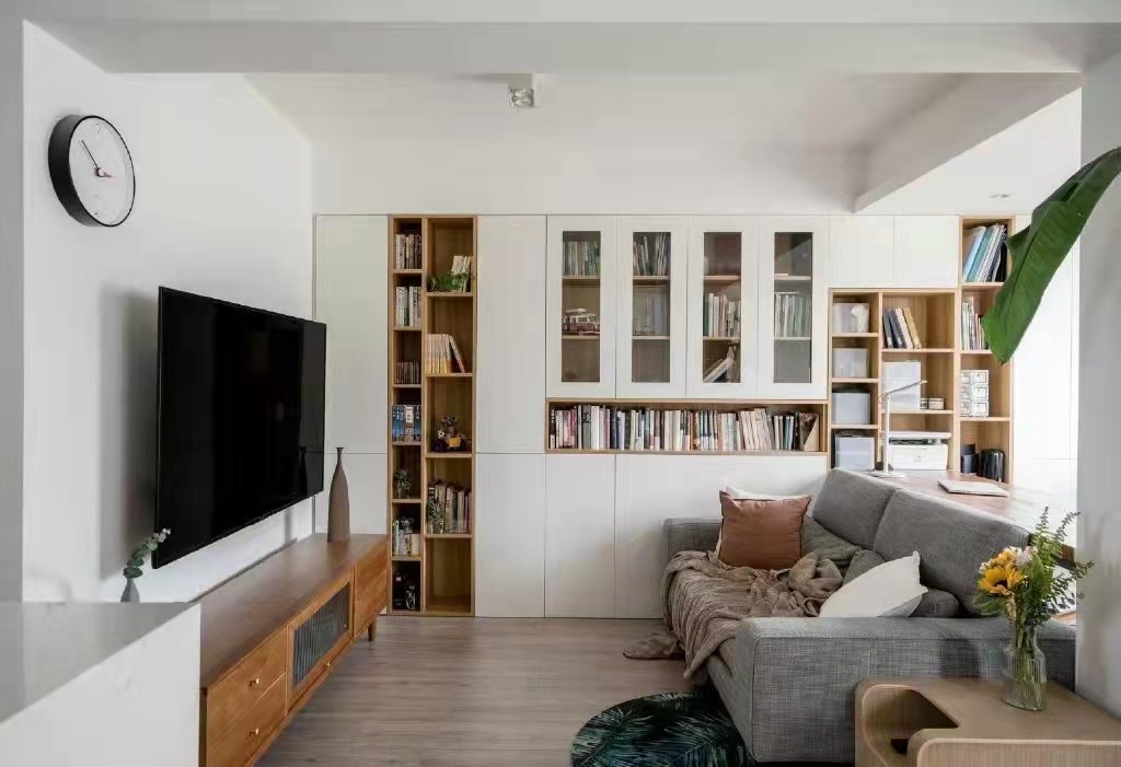 客厅的一面墙做成了白色书柜墙,玻璃柜门可以看到里面的摆设,
