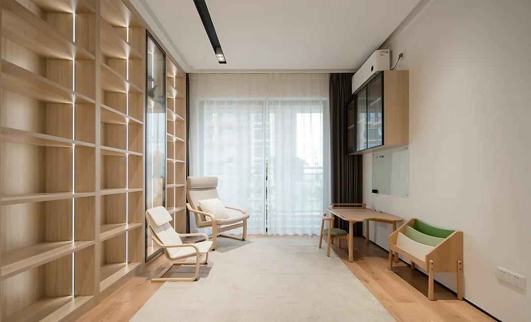 客厅做了满墙的书柜,包含了书架及乐高展示架的功能。右边是小朋友的学习空间,有属于TA随手可拿的小书架。在这个小家里每个家庭成员都有属于自己的区域,仪式感满满。