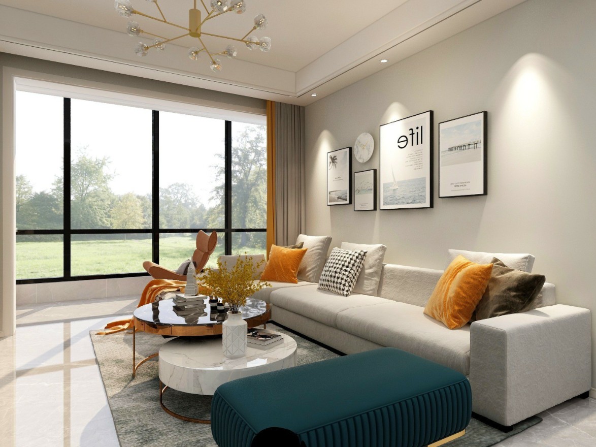 客厅为现代风格,色调以白色为主,浅蓝色点缀