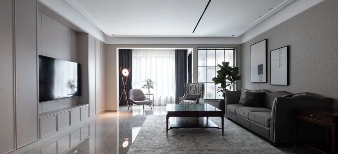 客厅空间整体灰色调的地面基础,天花简洁的吊顶加入无主灯设计,带来一个现代优雅的大气空间感。