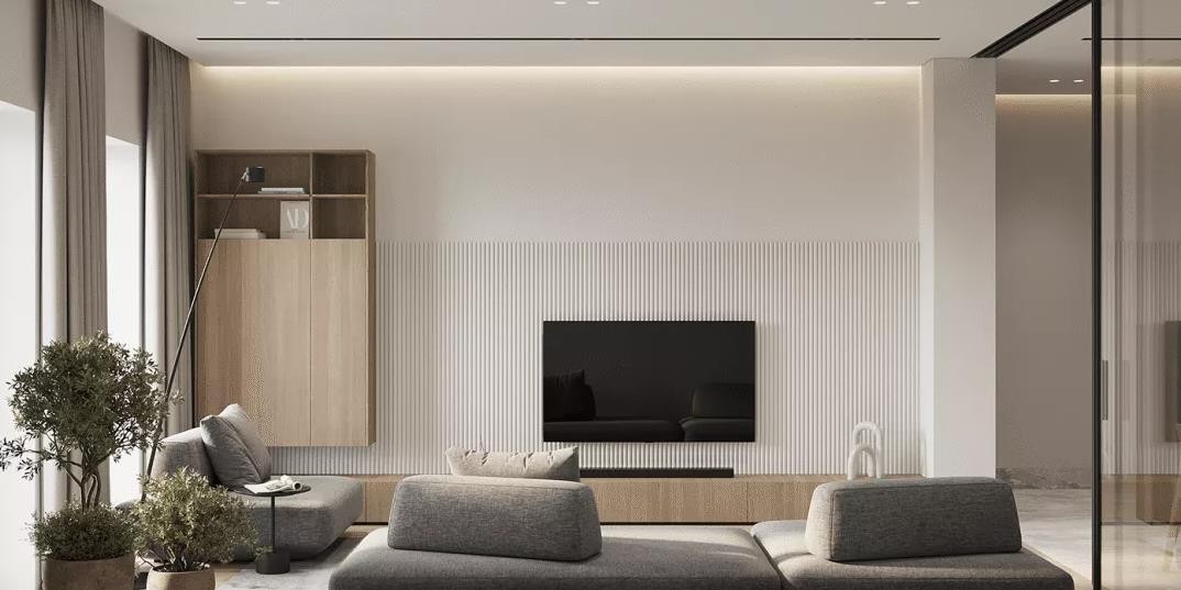 浅灰色沙发,灰白色背景墙,绿植的点缀,诠释着整个空间的温柔和静谧。