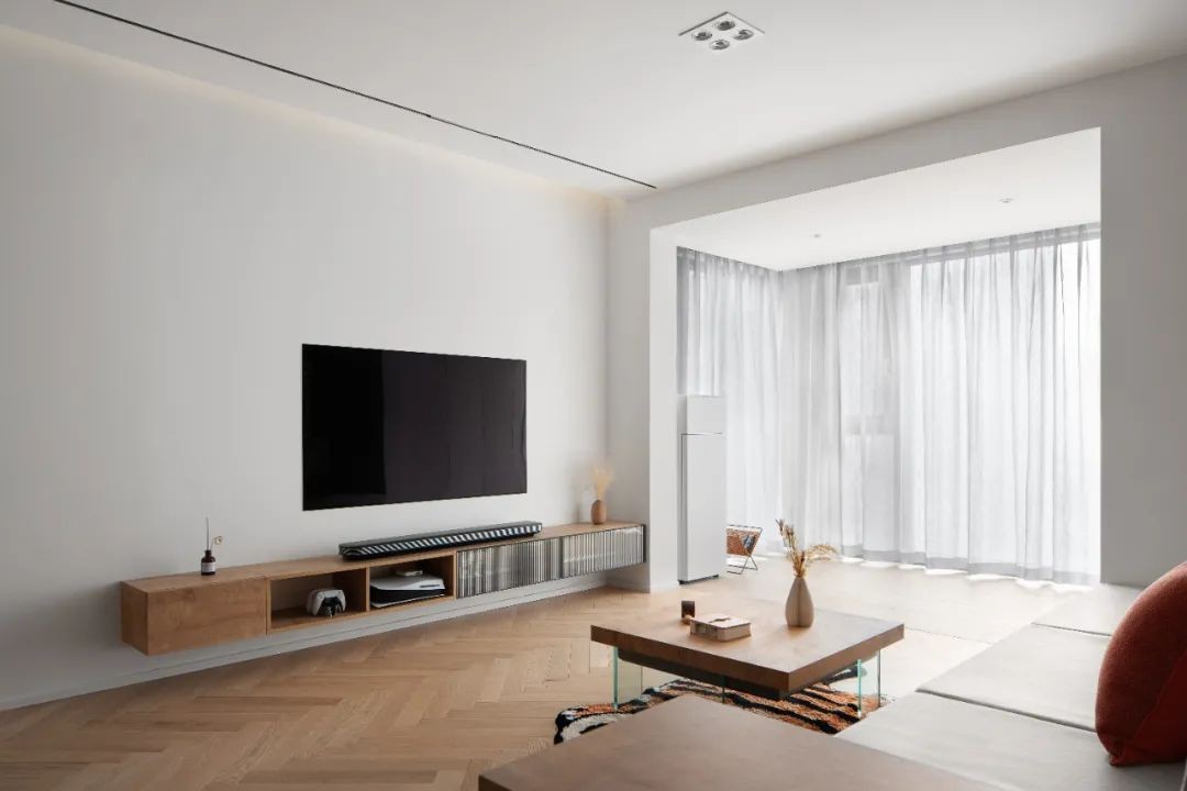 搭配同色系的床品+电视柜,没有多余的装饰,加上无主灯设计,营造出素雅静谧的睡眠氛围。
