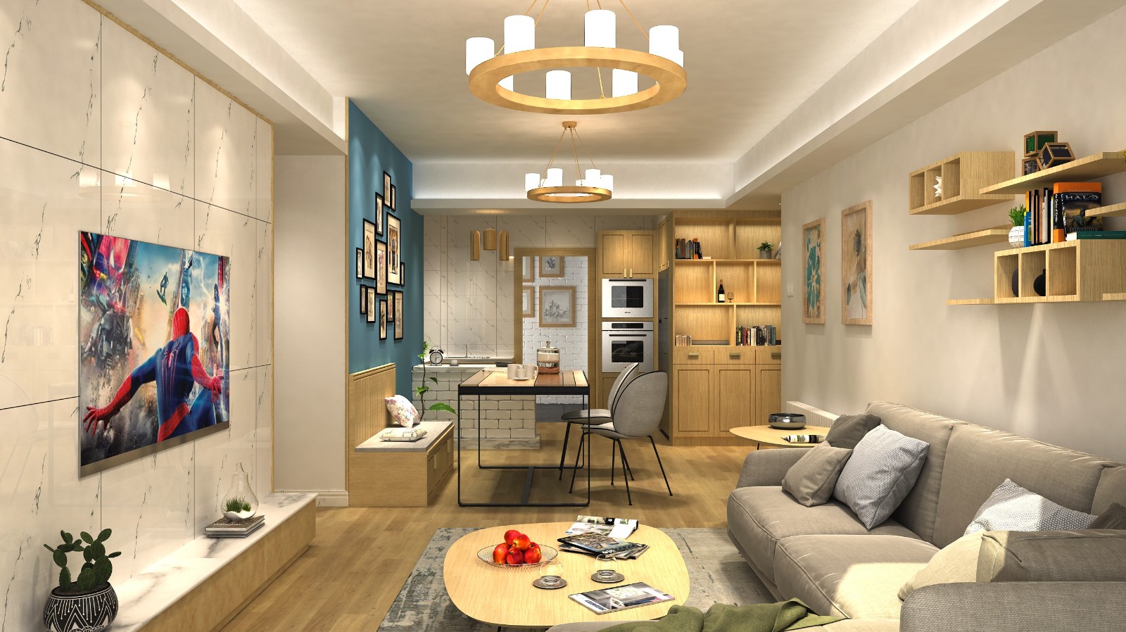 现代简约风格与原木田园的碰撞。原木色的家具搭配全屋实木地板凸显温馨,蓝色墙面增添了一分活跃,白色大理石瓷砖又赋予的空间简洁干练。