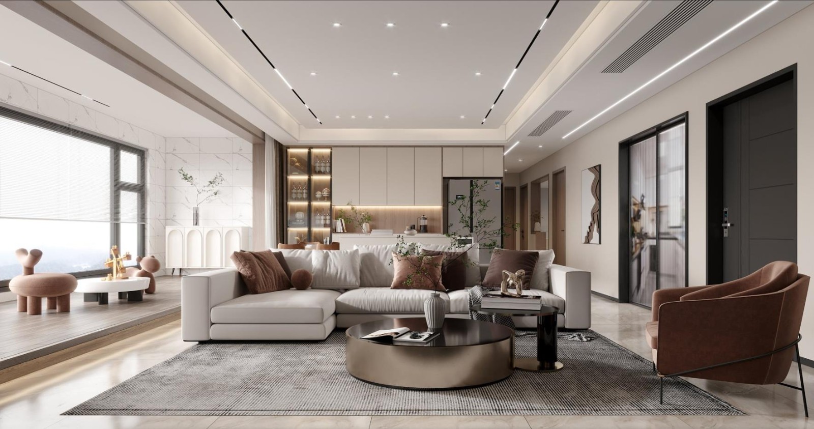 开阔的公共空间,简洁的硬装,搭配无主灯设计,让人莫名地舒服。