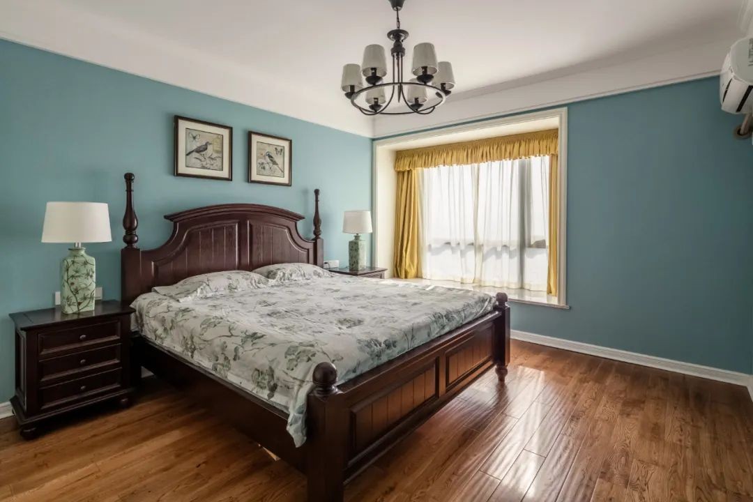 卧室以蓝色的墙面空间,搭配深沉的木地板,布置深色木床与床头柜,美式的靠床,两幅鸟儿图案的床头挂画,床头柜的儒雅台灯,整体空间显得安静而稳重,窗帘搭配上黄色的撞色,也让空间显得格外活泼雅致
