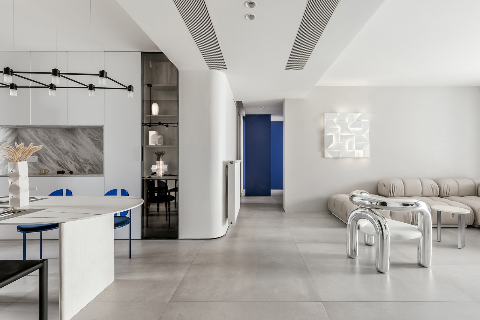 餐厅,延续客厅简洁白色为主色, 在与其他材质上作出了不一样融合。 岩板餐桌的大理石纹,咖色的嵌入 酒柜,湛蓝餐椅,平淡而不庸俗的 生活状态。