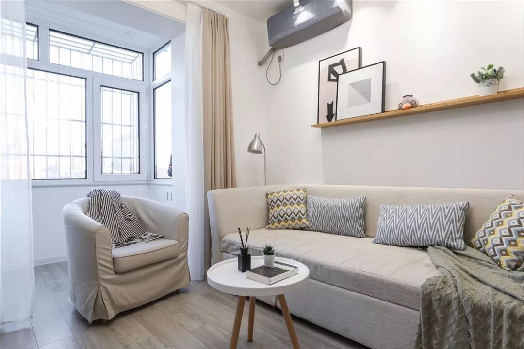 客厅处的设计比较简约、素雅一些,整体的色调以浅色系为主,淡淡的灰色和米色结合明亮的光线,让人感觉非常舒适。