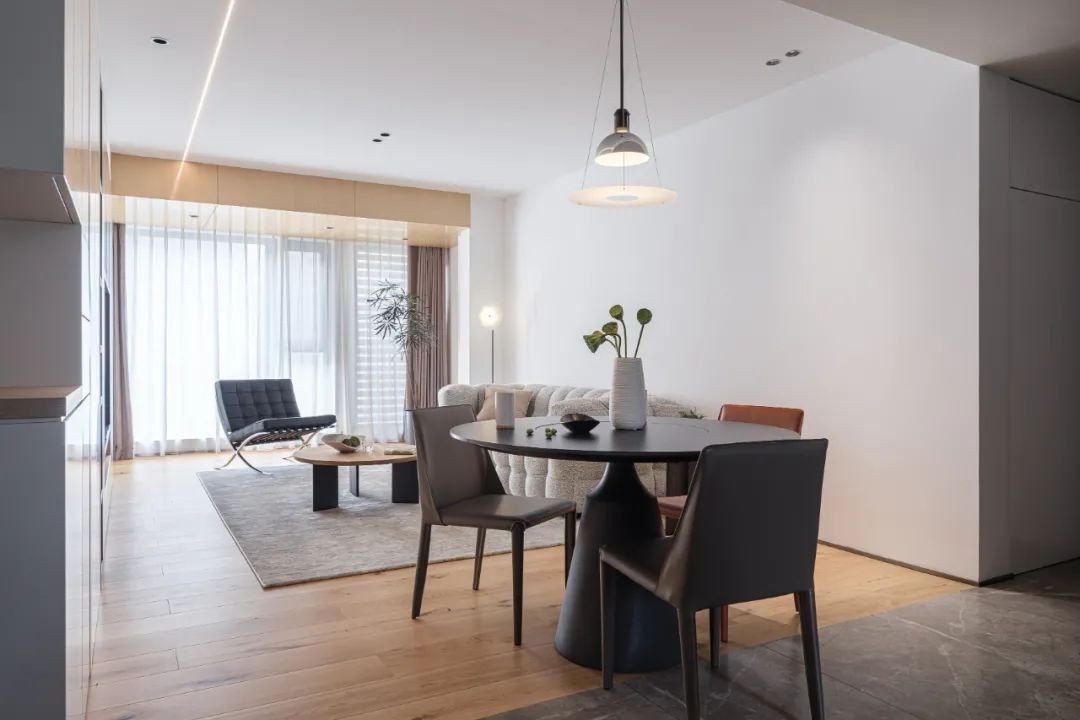 玄关进入便是开放式格局,客餐厅与厨房一览无余,这种敞开的形式将公共空间联系在一起聚合放大,释放出温柔的日常。 客餐厅地面采用原木色1900mm地板,原木的特性之间反映于空间里,让人更加放松,安心质朴的同时也了增加视觉上的张力。