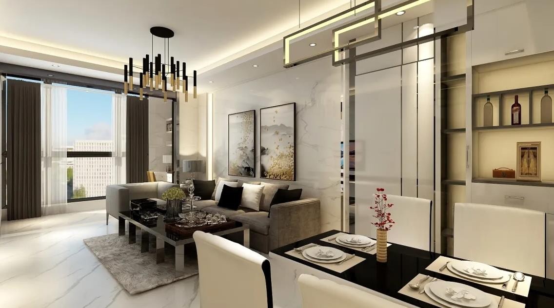 客厅设计将餐厅与客厅合为一体,增加了视觉上的通透感,视觉拉大