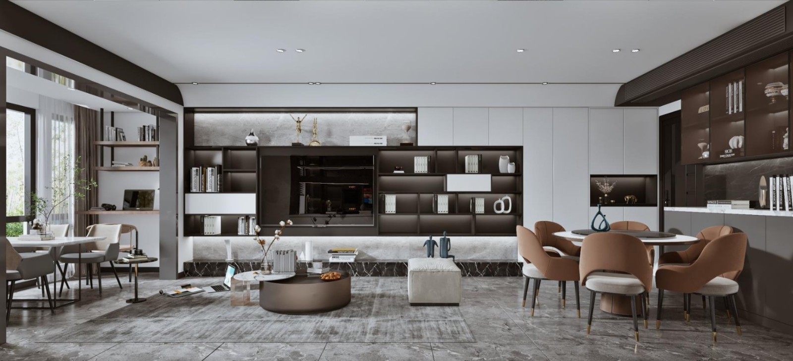 餐厅连在客厅旁边,餐椅餐厅收纳柜都以棕色设计,圆形餐桌,平时除了平时家里人吃饭,也可以容纳更多人聚餐。