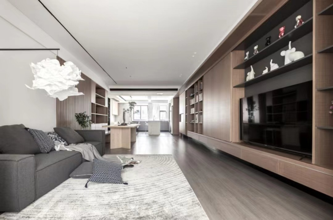 悬空的电视背景墙很好地平衡了进门视线的穿透性与私密性,同时下方的整排抽屉柜让镂空的台面得以保持整洁。