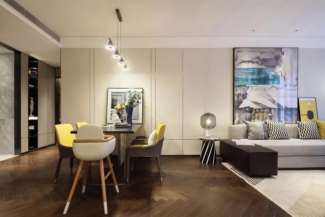 客厅沙发墙与餐厅背景墙连贯一体,餐厅背景墙是硬包装饰板,以独特的线条装饰,布置上优雅舒适的餐桌椅布置,一排独特精致又华丽的吊灯,也营造出了精致情趣的用餐气质。