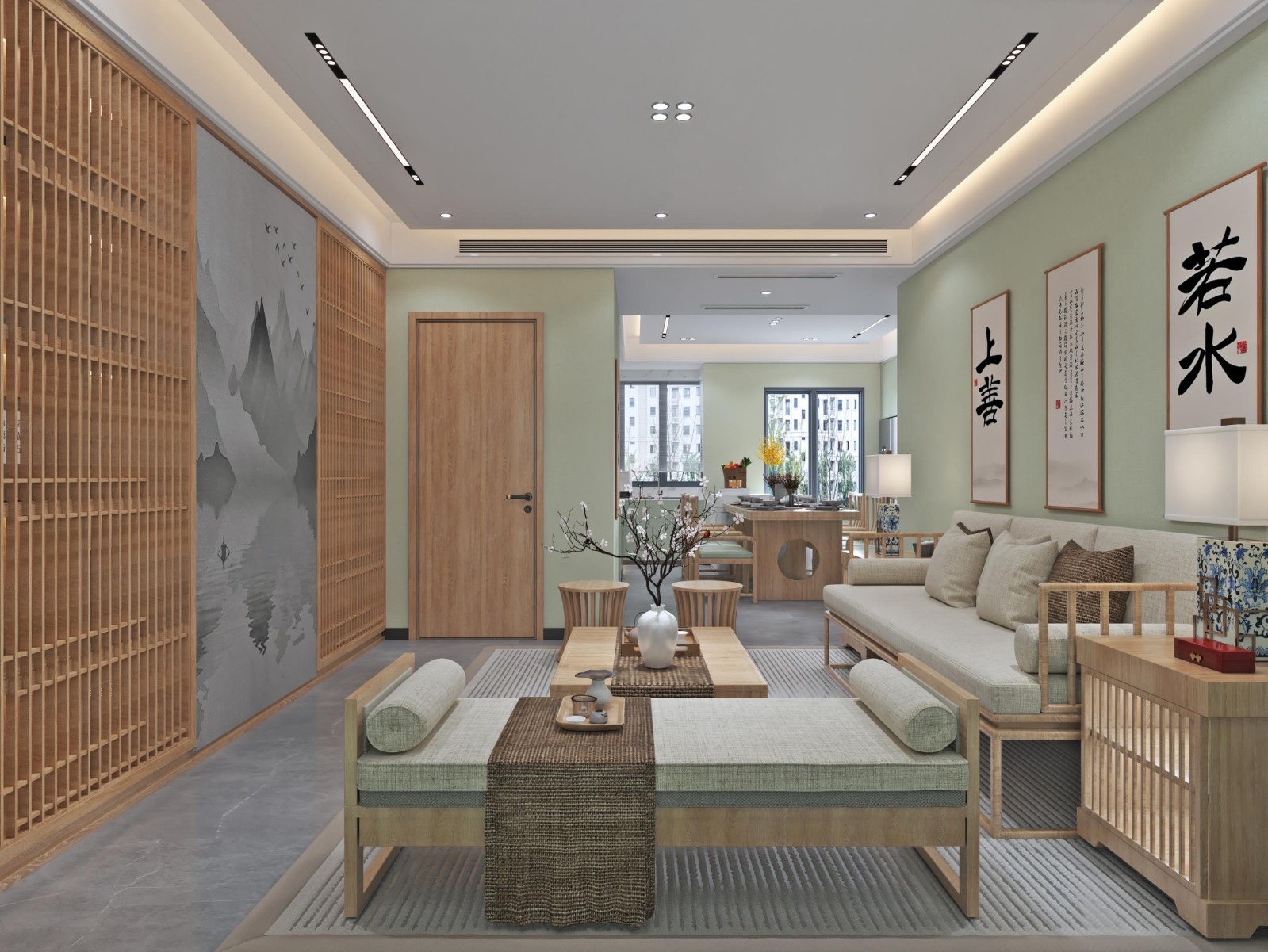 原木色的方型与精细的圆型线条、清晰的字画,让空间格外宁静。