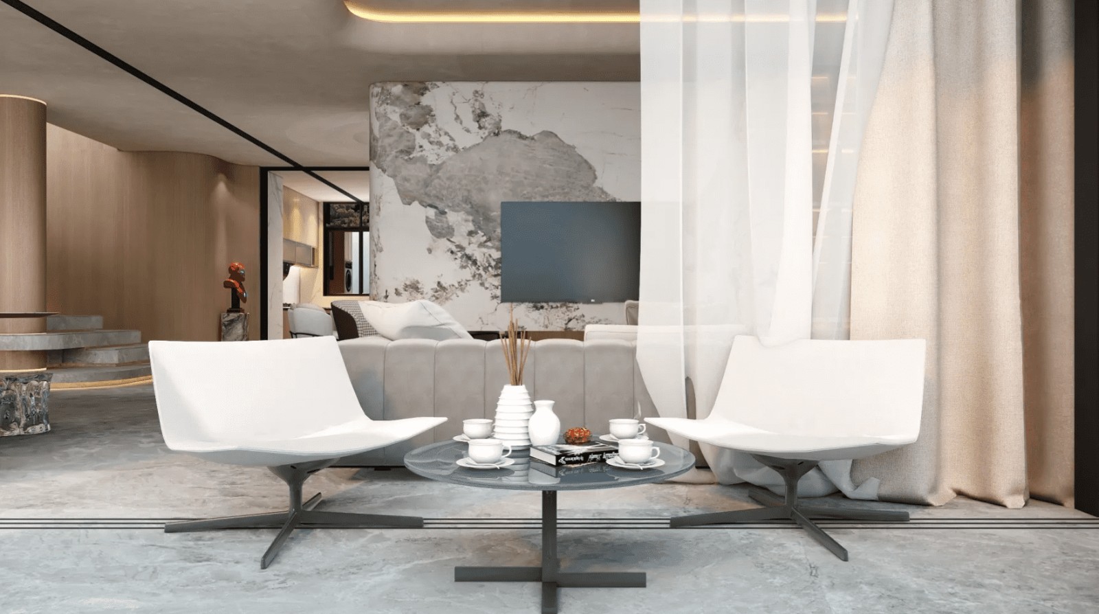 引入建筑学风格至室内设计,以立体维度的转变作为设计思路。三维立体的弧面与线条,贯穿整个空间的变化,展现动态感。