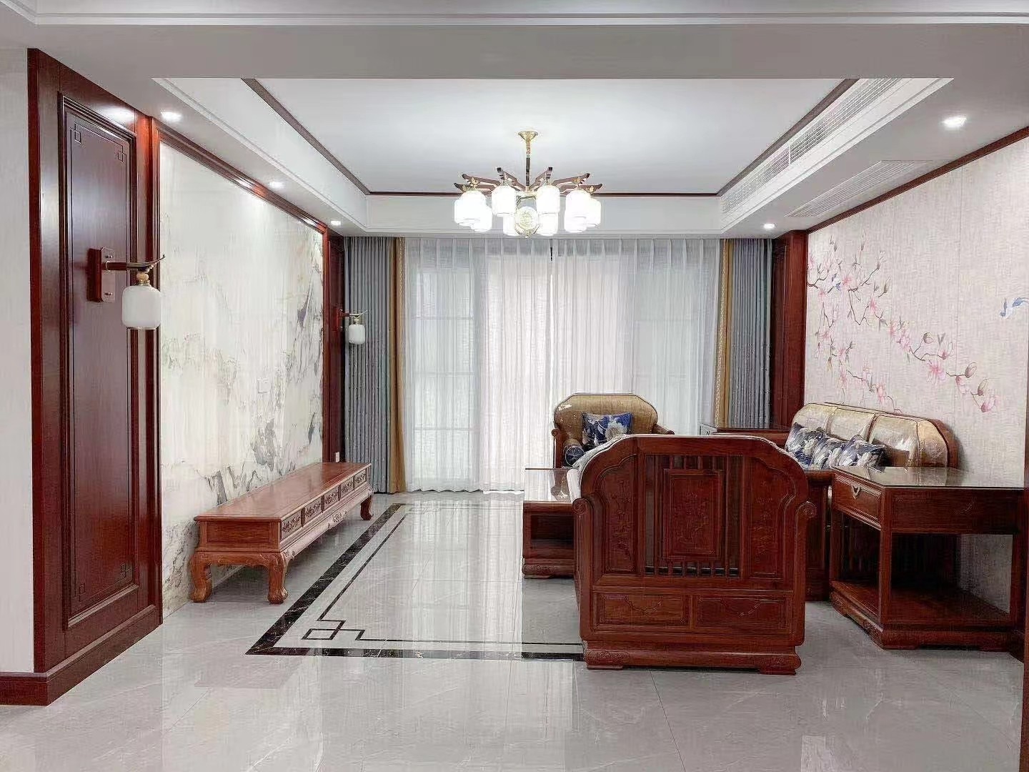 中式家具客户先购买,后按家具色调搭配整体,沙发背景中间选用硬包