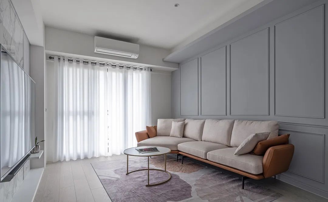 沙发背墙镶上线板雕刻 古典雅韵至此蔓延,灰阶则衬出白的纯淨与静谧 悄悄推开景深,墙面同步在水平和垂直向的延展下 藉收高方式拉升空间感,层层堆迭厅区大气风范 更贴心提供后方卧房足够隐私