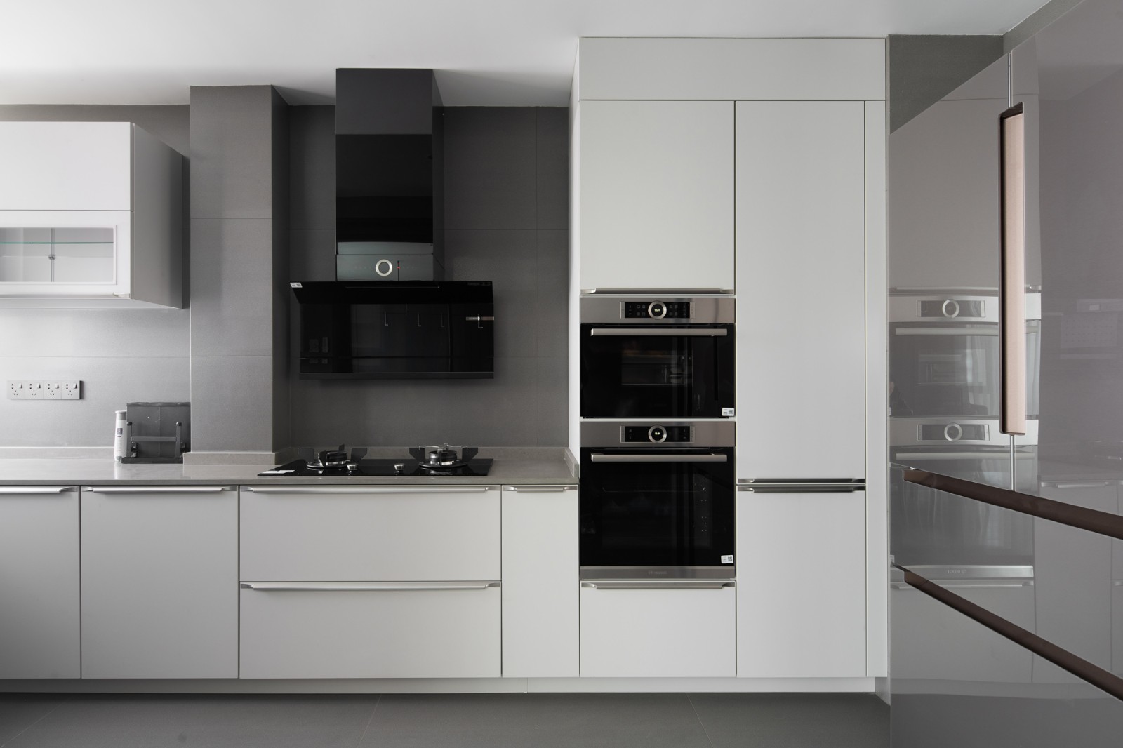 厨房体现操作性和实用性,选择墙地砖和操作台的同灰色和橱柜的白对比,营造素雅温馨的烹饪氛围。