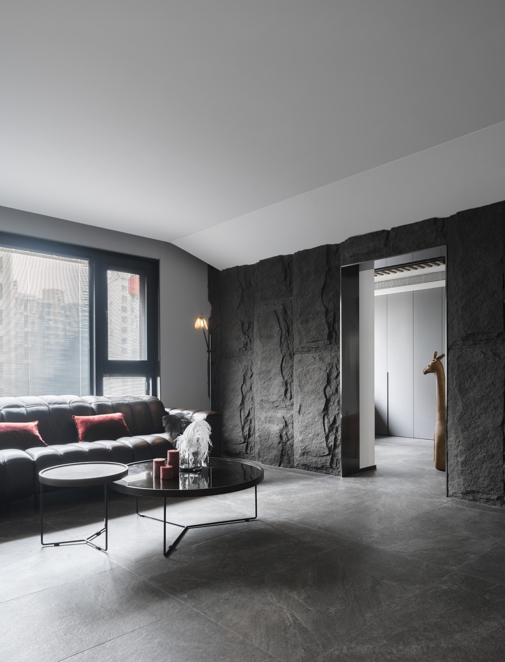 客厅与衣帽间相连的背景墙,铺贴一面天然石皮,搭配水泥灰纹理地砖、硬朗的皮革沙发,家有了粗犷不羁的气质。