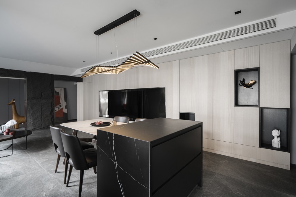 厨房选用同色系肤感铁灰橱柜,搭配白色系大理石纹墙砖,既耐脏好打理,又显得整洁干净。 考虑到房屋本身情况不错,我们选择防水防潮的石膏板吊顶,和餐厅保持一致。洗碗机、厨房空调等家电的使用,让烹饪变得更从容。