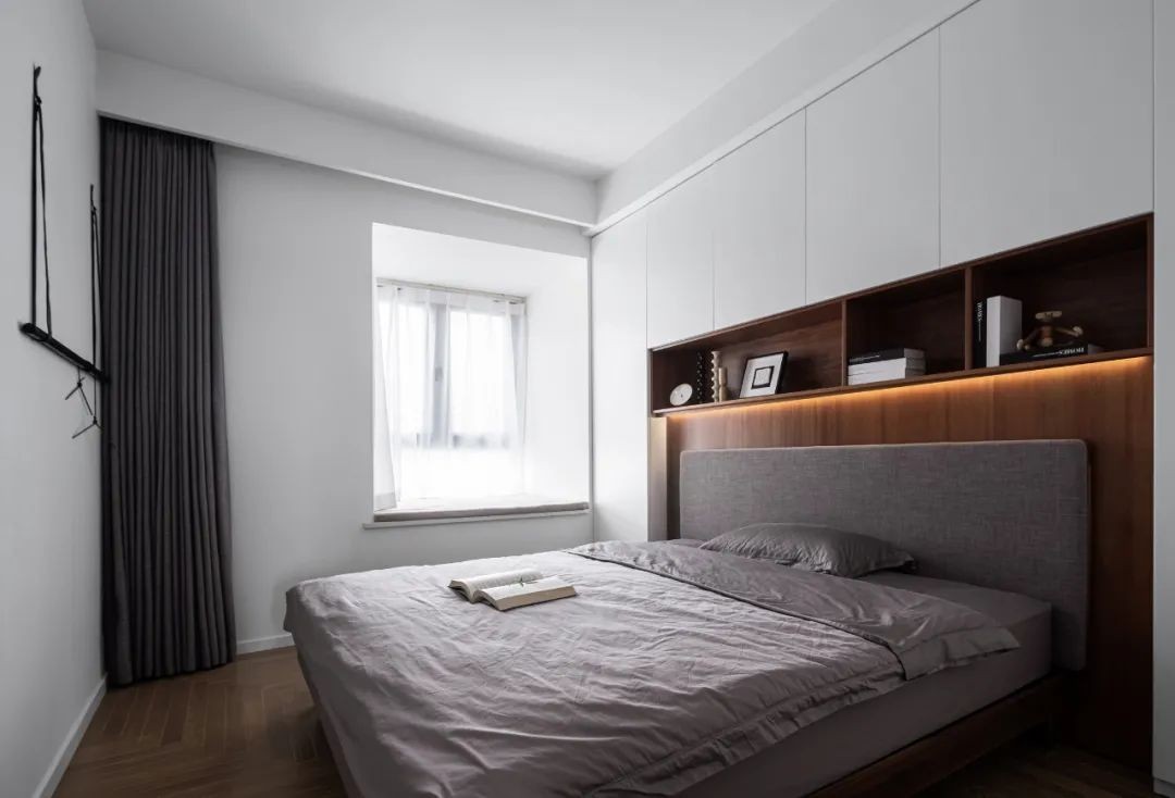 主卧尺寸不足,如按照常规侧面摆放衣柜,过道太窄无法使用。采用床头一体柜设计,深得屋主的喜爱,满足主卧室必备的衣物收纳