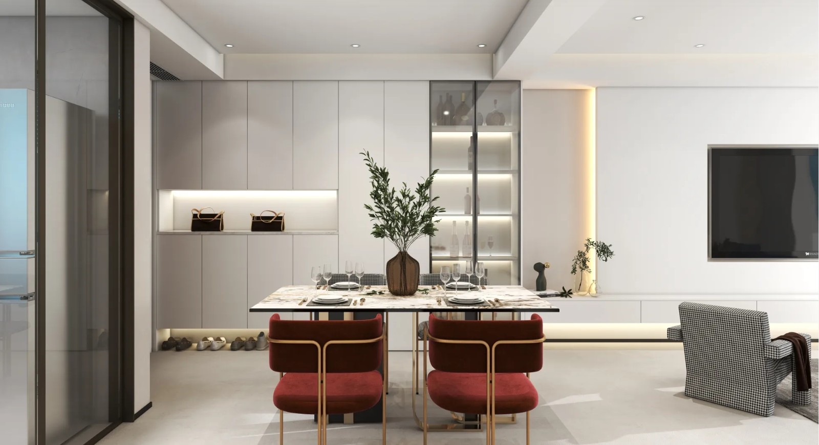 整体柜子打造的平整加灯带,制造氛围感,加上软装的点缀,使空间更加暖一些