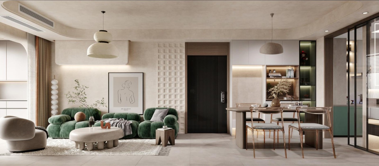 通过乳白色、原木色等色彩组合,以简约质感的调性加持,搭配软装打造高颜值高品质的温馨家居空间。