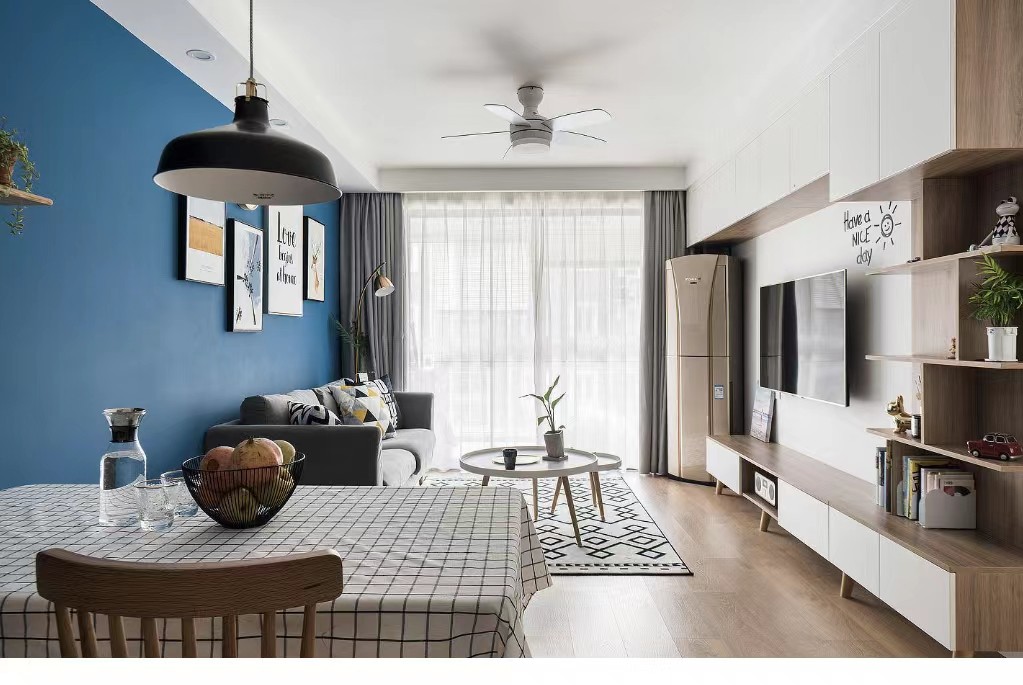 蓝色的背景墙克制二冷静,另一侧用白色打底
