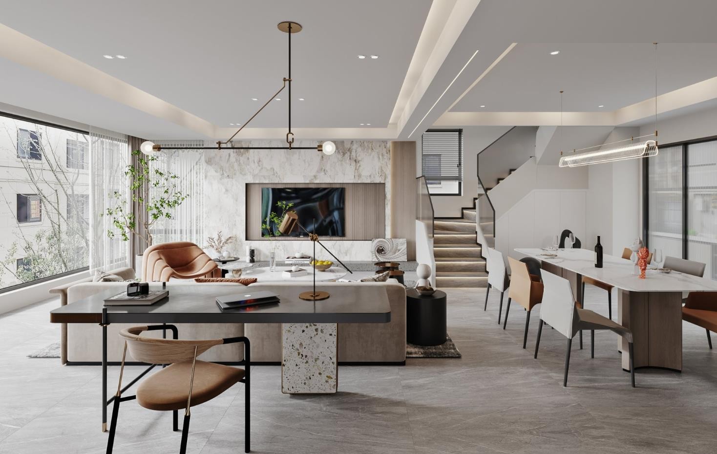客厅、餐厅和厨房都在同一空间下纵向看整体空间十分开阔。