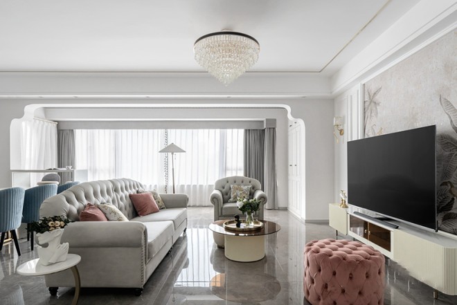 三房格局南北采光通风, 厨房扩大后整体空间更明亮;客餐厅横向布局空间充分利用增加了储物功能也满足了观影视距;主卧与阳台打通后空间更开阔。