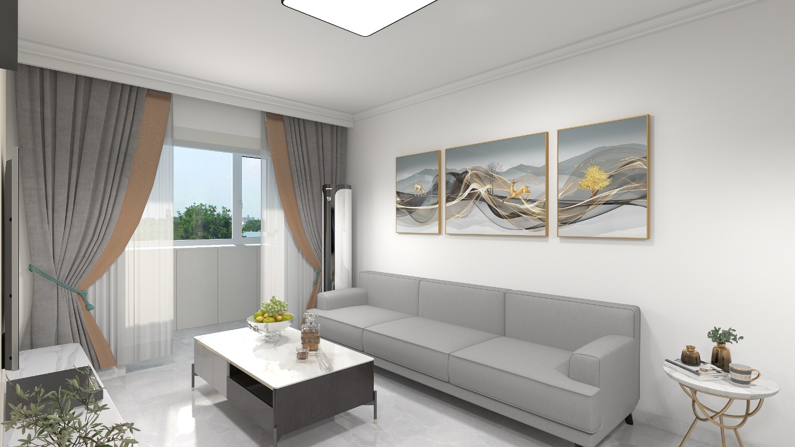 简约的客厅设计讲究通透感,家具样式颜色与空间环境搭配,地砖采用了简约的浅灰色搭配洁白的墙面,局部进行墙面色彩搭配,窗帘双色衬托。