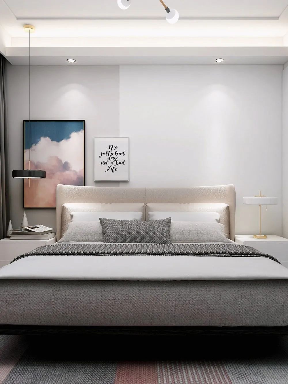 卧室墙面选取低饱和度的奶白色,与家里其他空间的“白”相呼应。灰色的床品,营造出时尚别致的家居美感。
