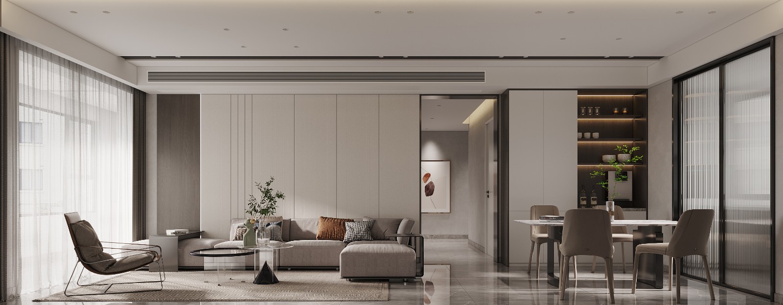 吊顶采用无主灯设计,让空间显得更大。整体色调统一。