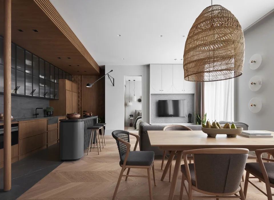 客厅设置在中心区域之后,整个屋子亮起来了,自然光线渗透进来,可享受每日的光影变化和季节的变换,沙发的灰色与吧台以及墙面为同色,空间连续性更好,而原木的点线面更是有节奏的出现在空间每个角落。