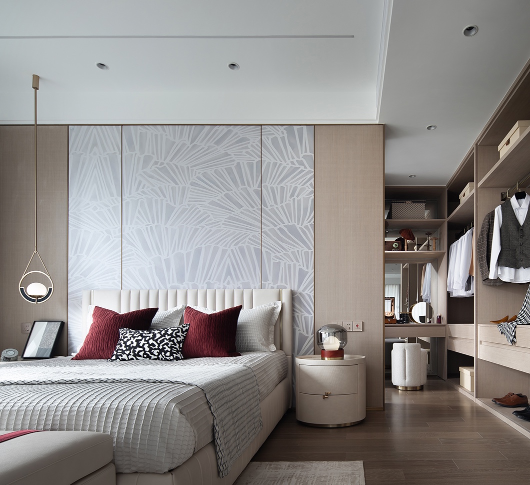 材质的延续像空间的脉络,从公共空间到私密空间,浅色温润的木地板以及大面积的带有温暖手感的墙面,大面积的落地窗,再次的将“拾光留影”的框架搭建起来,令光影以温柔的姿态映射进卧室内。a
