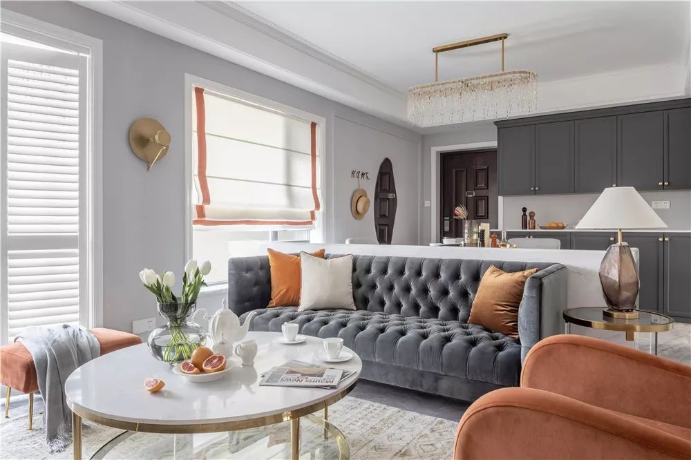▲ 客厅以深灰色为主色调,主打空间的沉稳感,焦糖橙色作为空间的辅助色彩,给空间带来活力的同时,也带来全新的感受。