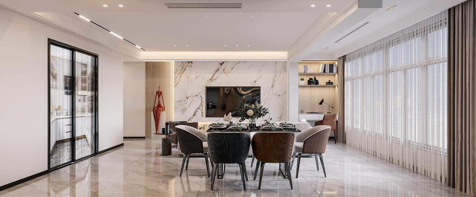 木饰面大理石背景搭配客餐一体化设计