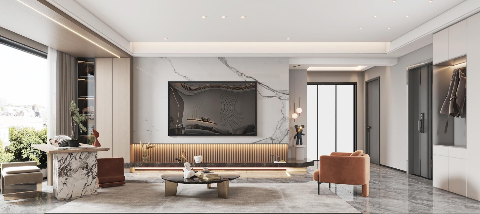 背景硬包简约设计搭配无主灯及线性灯空间感更强烈