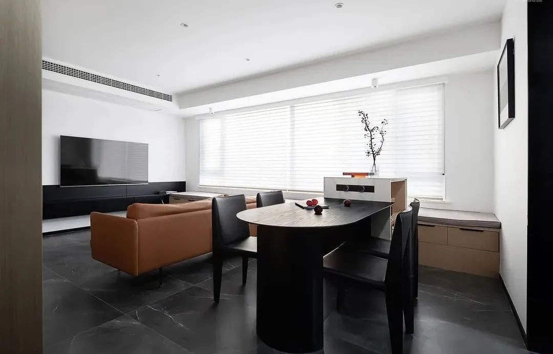 客厅正中的橘色沙发自带温暖属性,在整个黑白灰空间中如一道赤霞橘光。沙发与餐椅背靠背无缝衔接,用女业主的话来说,就是把空间利用到***,丝毫不浪费!开放式的客餐厅给了空间大的视野,无主灯慢慢变成主流,免去了打扫的烦扰,