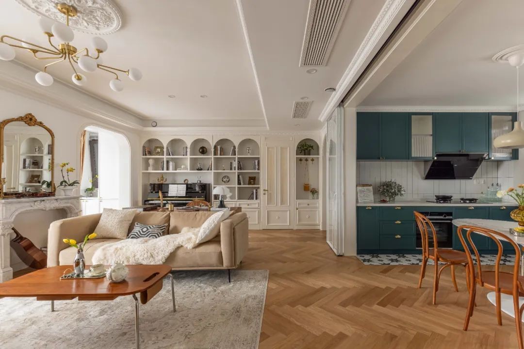 简约的设计安静而美好,设计师在材料与颜色下足了功夫, 米色的沙发背后是一个隐藏式书架,木色的茶几,精致的 吊灯,让设计与生活和谐相融。整个空间以温润的颜色为基底 辅以材质与颜色的碰撞光线与空间互动,营造出简约优雅的法式格调 餐厅和厨房一体化设计,L字型厨房,精致小巧的吊灯, 原木的收纳柜和餐桌餐椅,坐在优雅舒适的餐桌前,品尝 这美食、透过小小的窗户远望窗外的美景,十分惬意浪